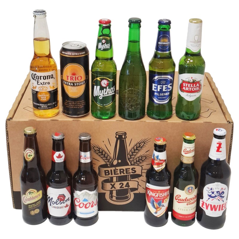 2 Corona 33cl (Mexique), 2 Trio Stout 50cl can (Allemagne), 2 Mythos 33cl (Grèce), 2 Alhambra 33cl (Espagne), 2 Efes 33cl (Turquie), 2 Stella Artois 33cl (Belgique), 2 Casablanca 33cl (Maroc), 2 Molson Canadian 33cl (Canada), 2 Coors 33cl (Etats-Unis), 2 Kingfisher 33cl (Inde), 2 Budweiser Budvar 33cl (République Tchèque) et 2 Zywiec 50cl (Pologne).